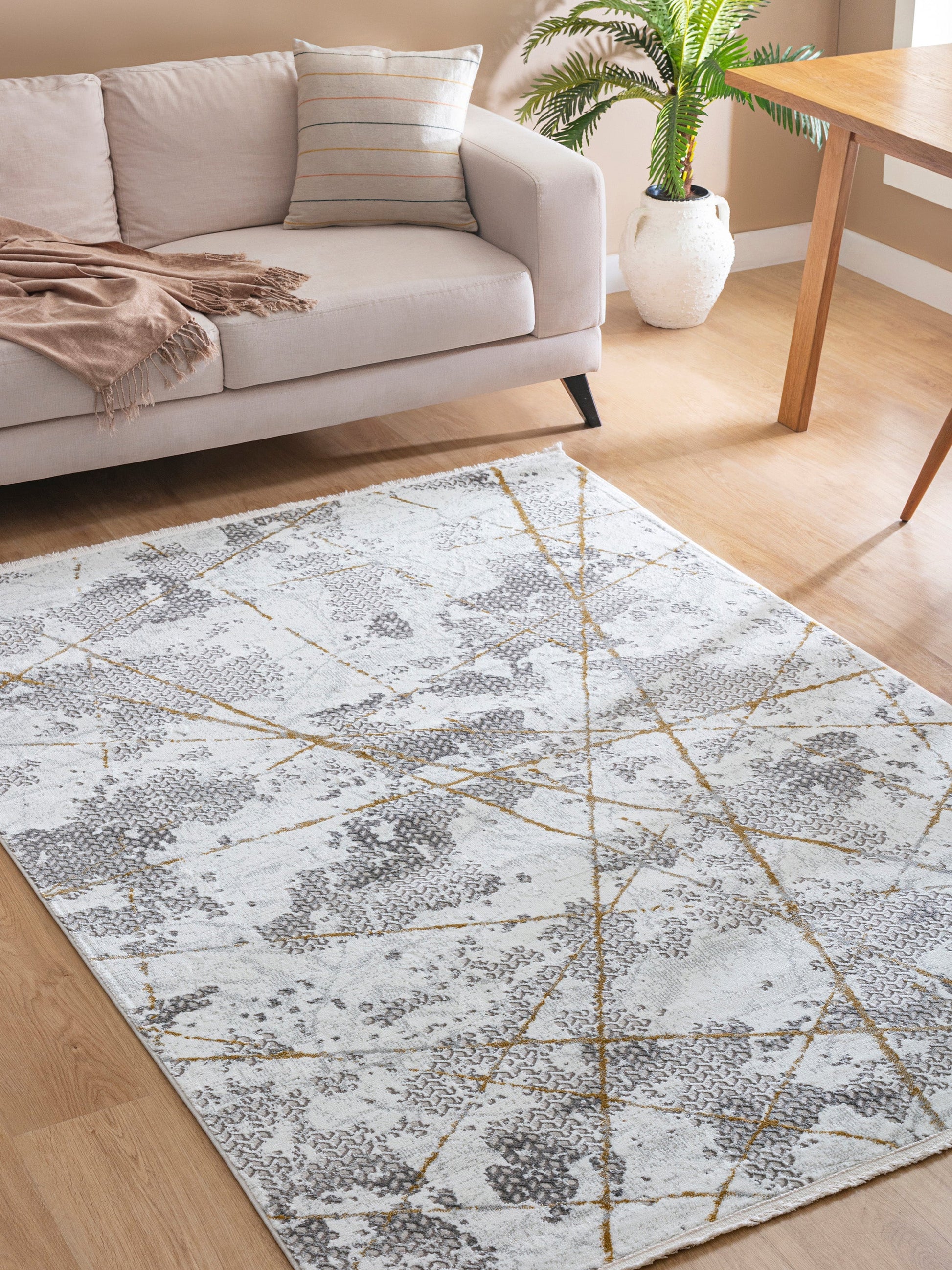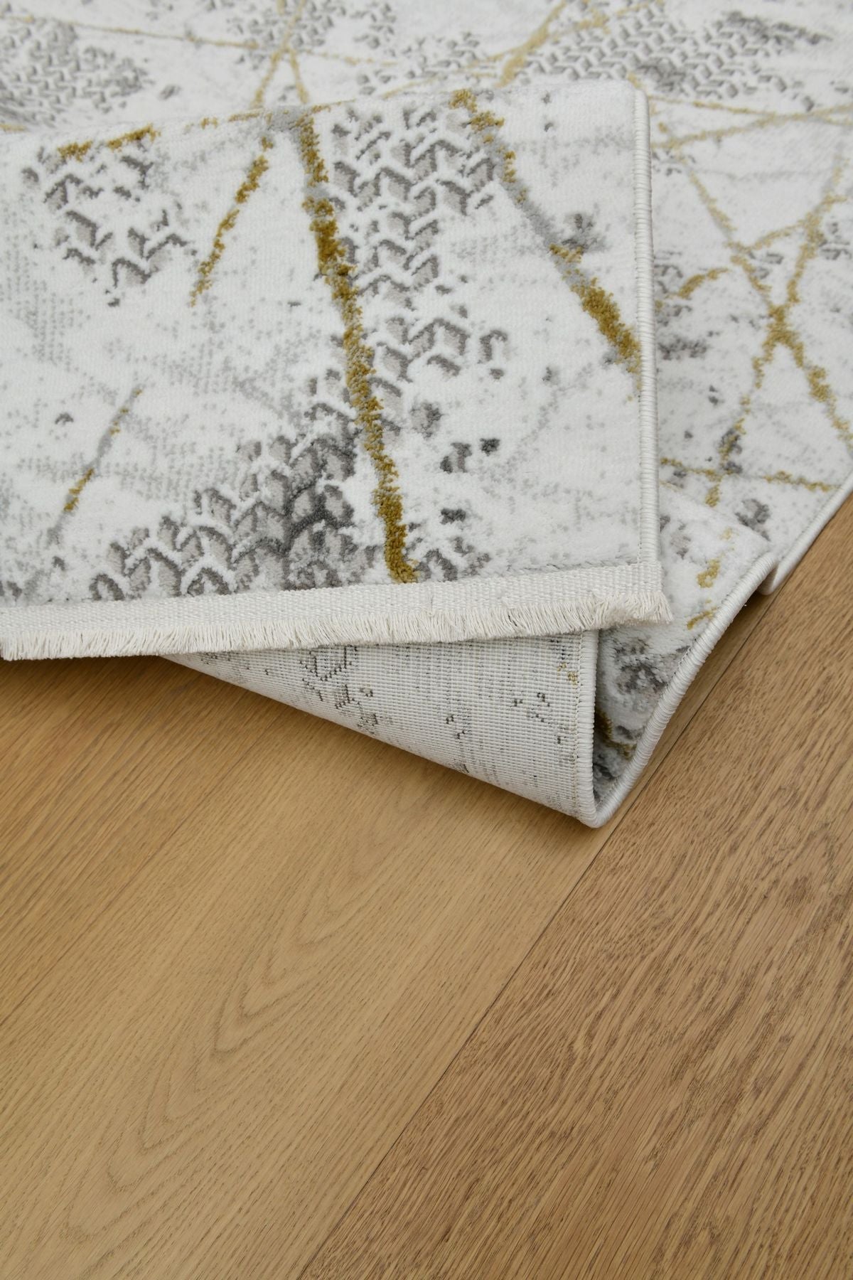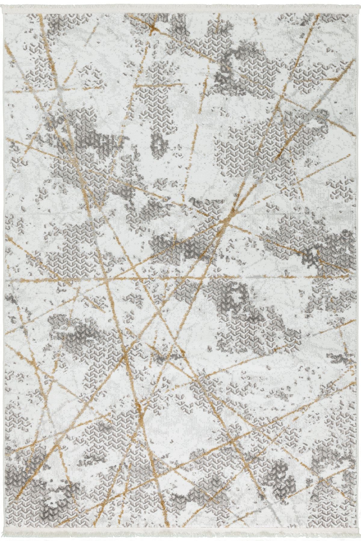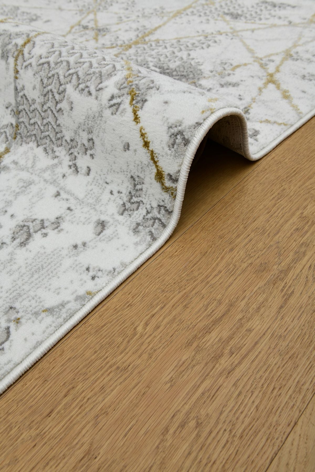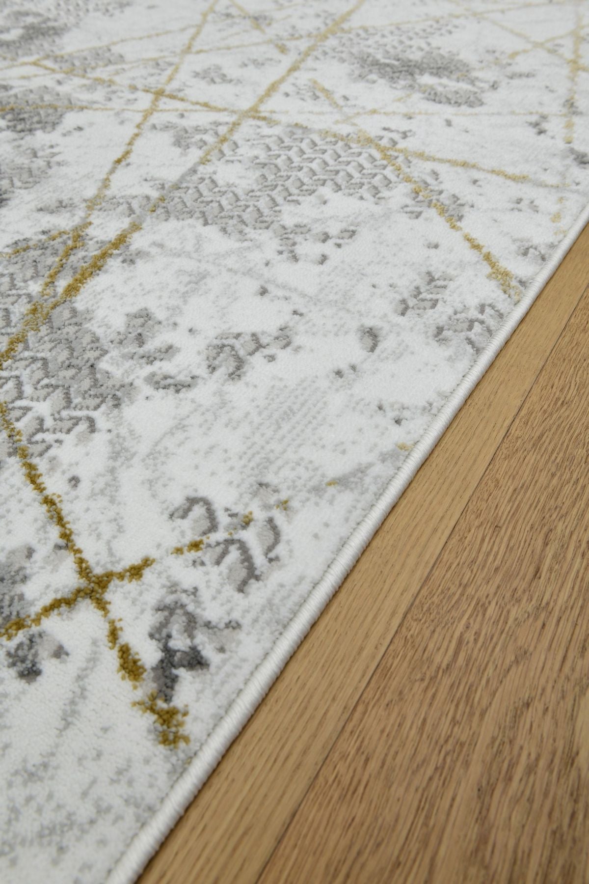 Astra GuldLinj kombinerar abstrakta skuggmönster i grått med tunna, eleganta linjer i guld som korsar ytan likt ett modernt konstverk. Den ljusa botten lyfter fram kontrasten och ger mattan en exklusiv men samtidigt inbjudande karaktär.