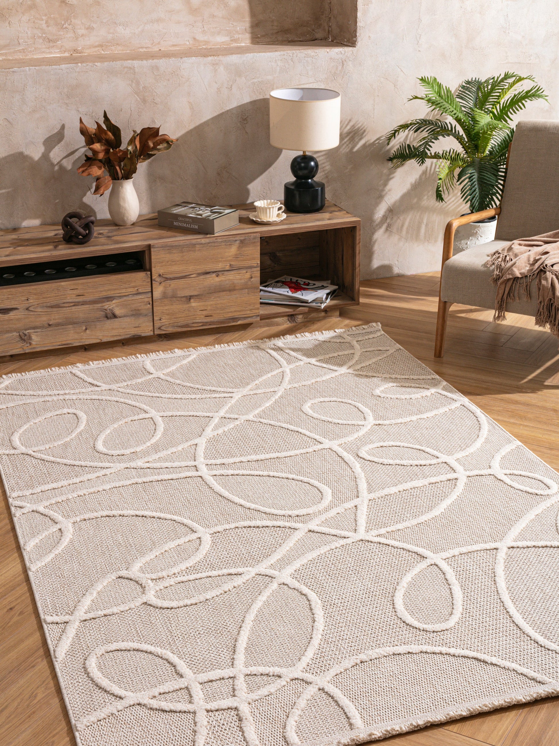 Focus NaturSlinga är en ljus, elegant matta med lekfullt slingrande linjer som skapar en känsla av rörelse och lätthet. Den ton-i-ton-beiga färgskalan bidrar till en harmonisk helhet och gör mattan lätt att integrera i olika typer av inredningar – från minimalistiska till klassiska miljöer.