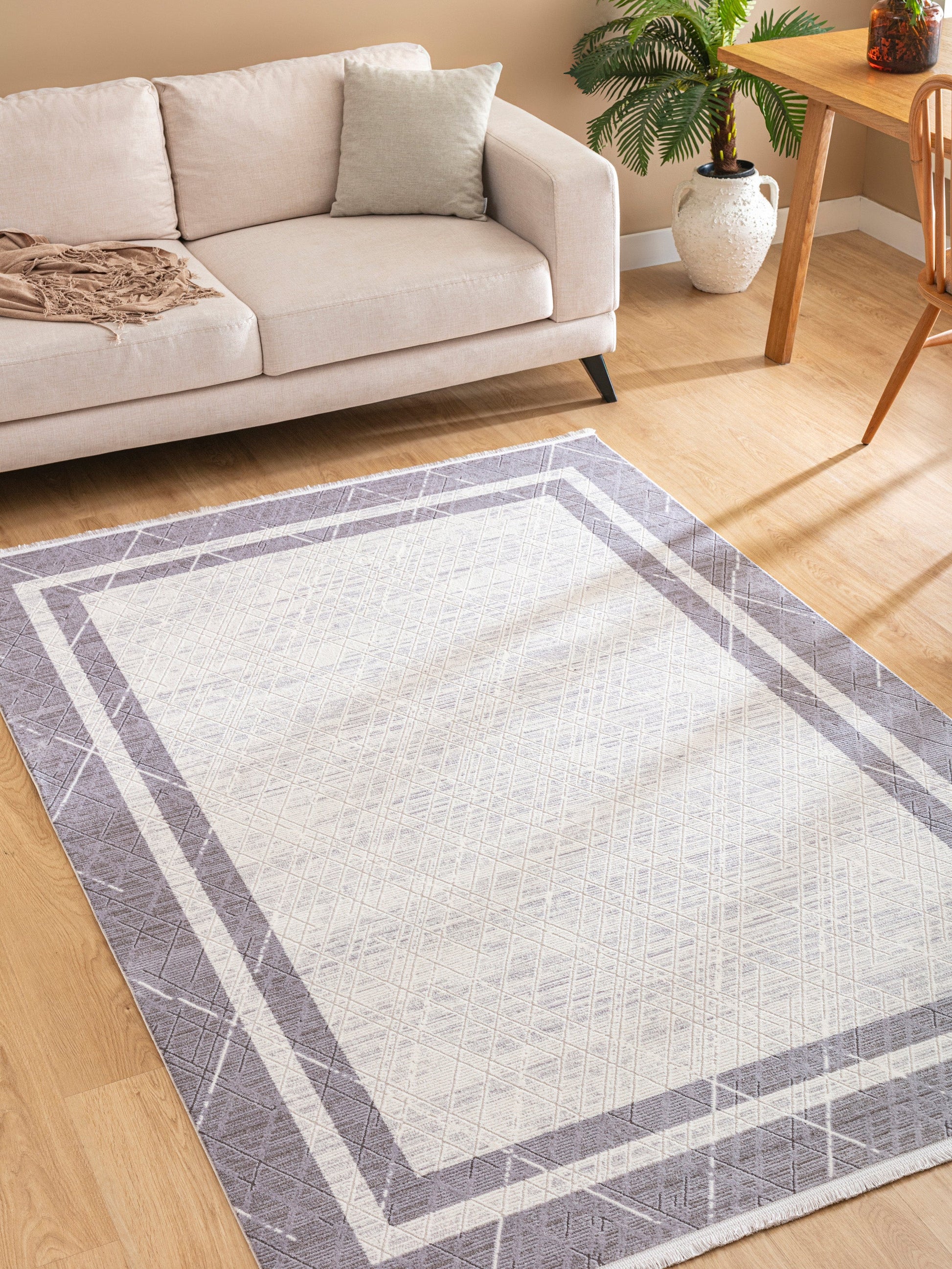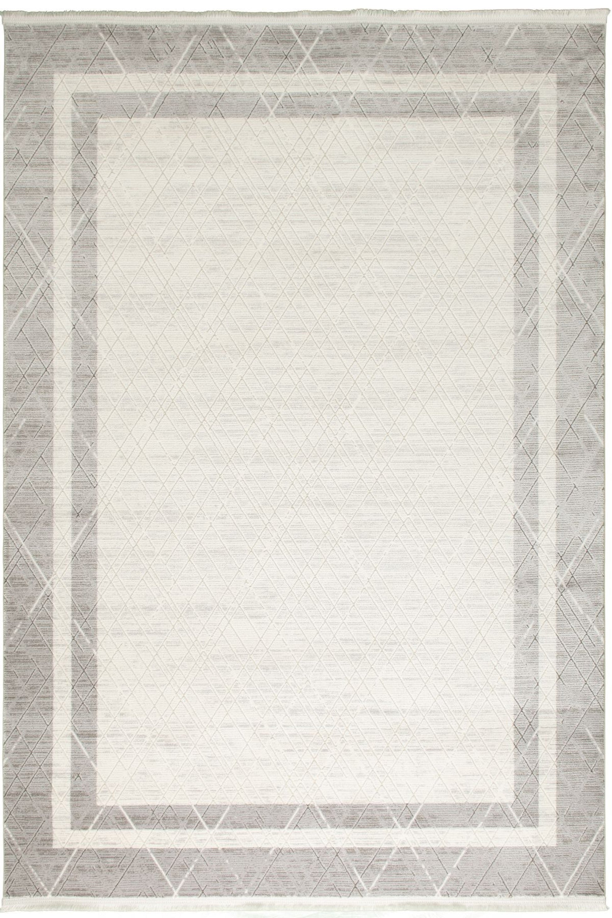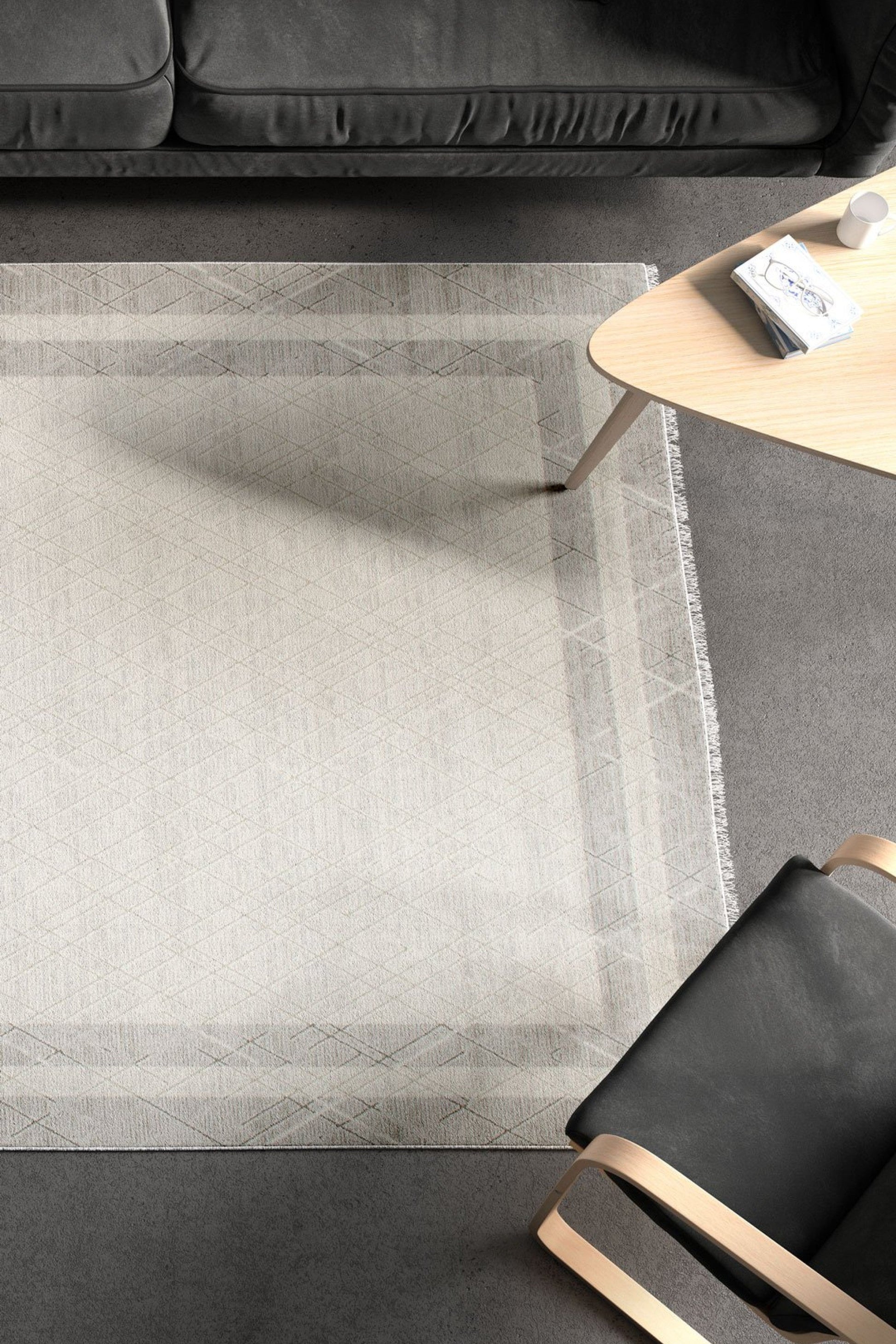 Galata LjusGeometri är en modern matta med subtil elegans och geometrisk lätthet. Den ljusa basen bryts upp av ett diskret korsat linjemönster och en mild ram i grå toner, vilket skapar en känsla av djup utan att ta över rummet.