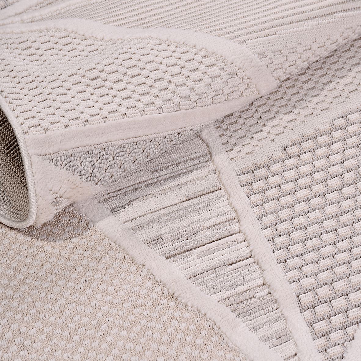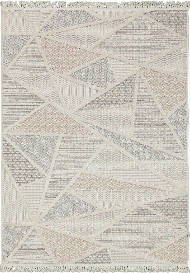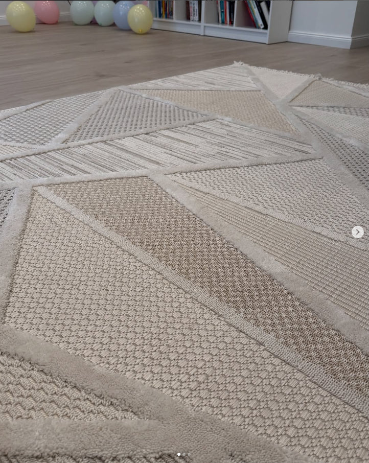 Izmir Dune är en modern matta med en distinkt geometrisk design som för tankarna till stiliserade sanddyner. De triangulära formerna i olika strukturer och nyanser ger en livfull och samtidigt balanserad estetik. Den subtila färgpaletten i beige, grått och elfenben gör det enkelt att matcha med skandinavisk inredning.