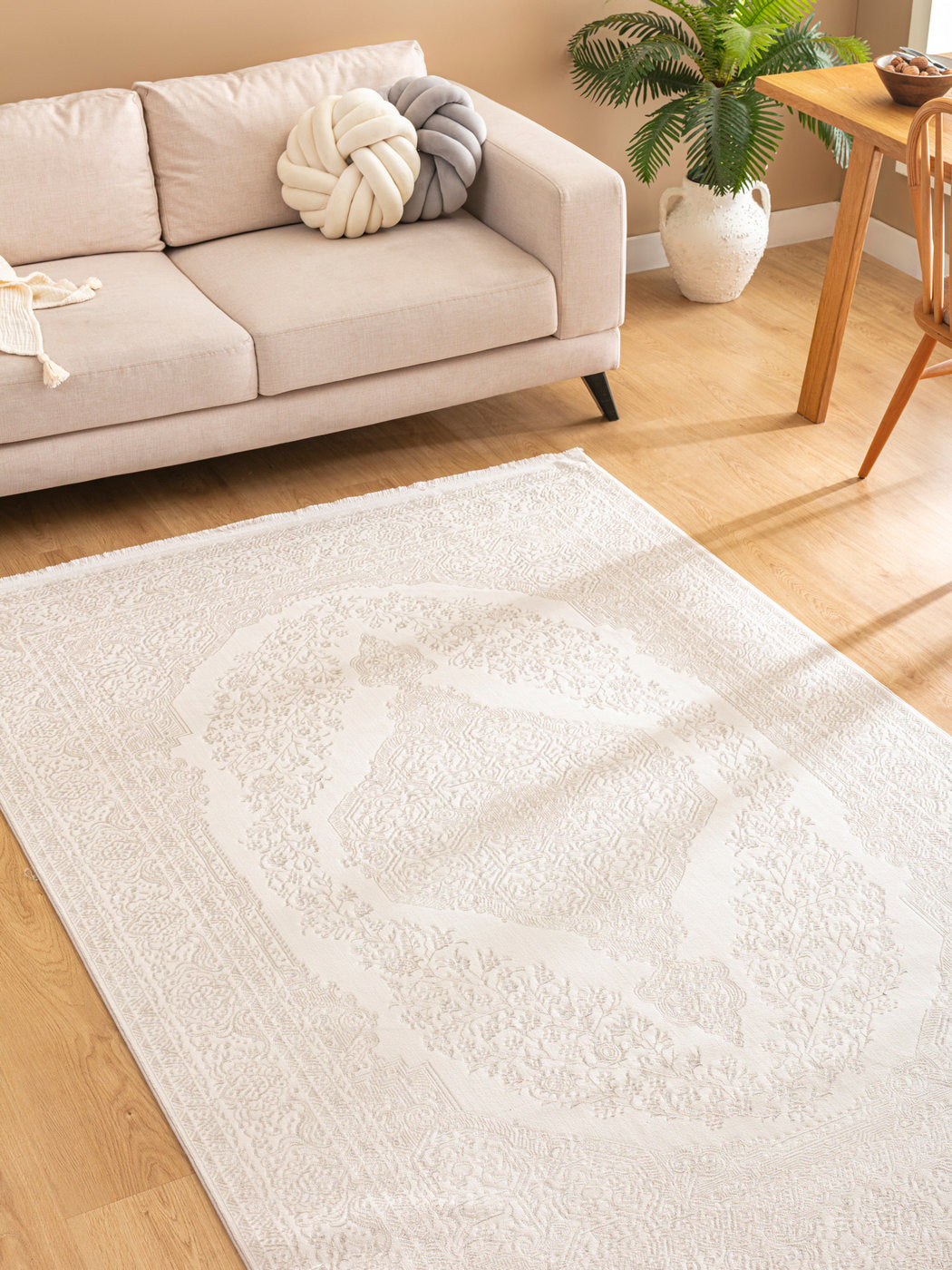 Jakarta Pärlvit utstrålar stillsam prakt med sitt ton-i-ton-mönster i pärlvita och beigea nyanser. Den klassiska medaljongformen och de eleganta blomdetaljerna smälter samman med den silkeslena ytan och skapar en matta som är lika sofistikerad som tidlös.