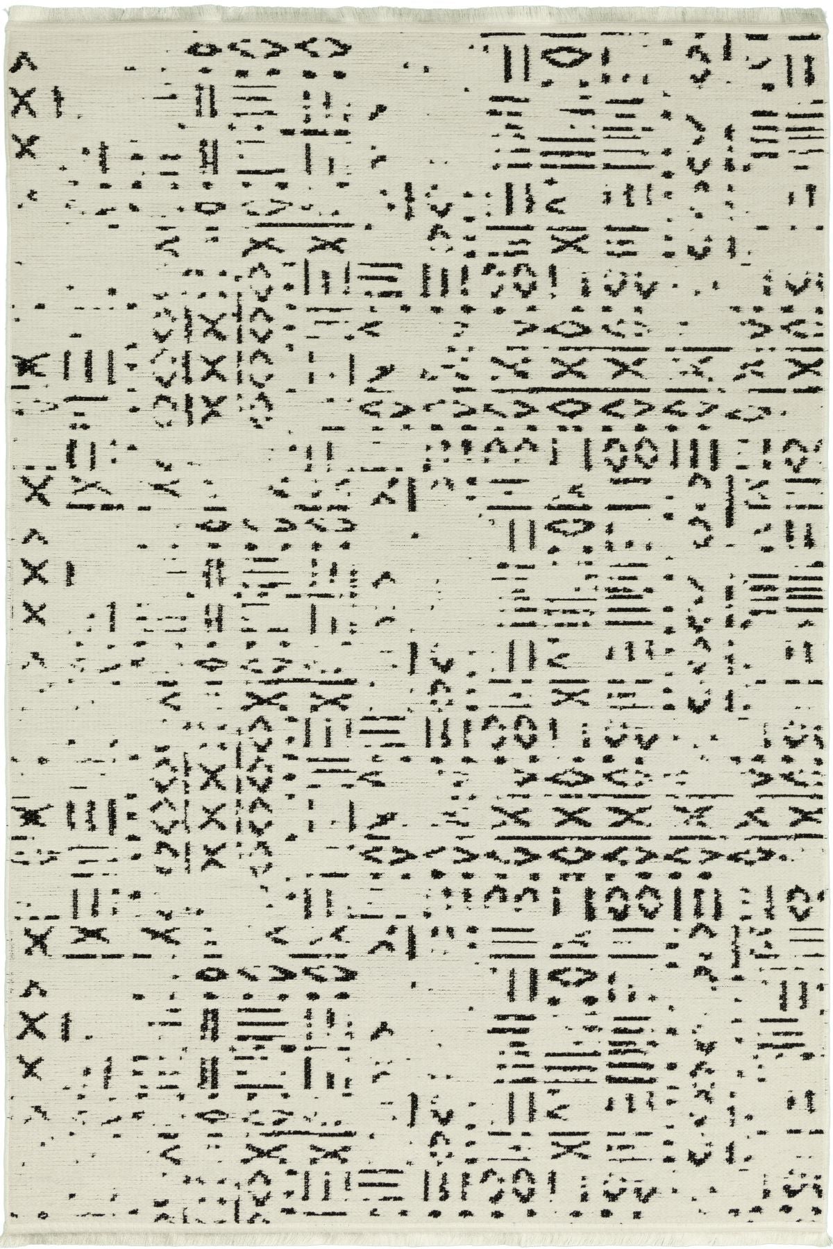Luna NomadVit är en ljus matta med ett distinkt, svart mönster inspirerat av nomadisk symbolik. Den benvita botten skapar en luftig och modern känsla, medan det grafiska trycket ger rummet karaktär och djup.