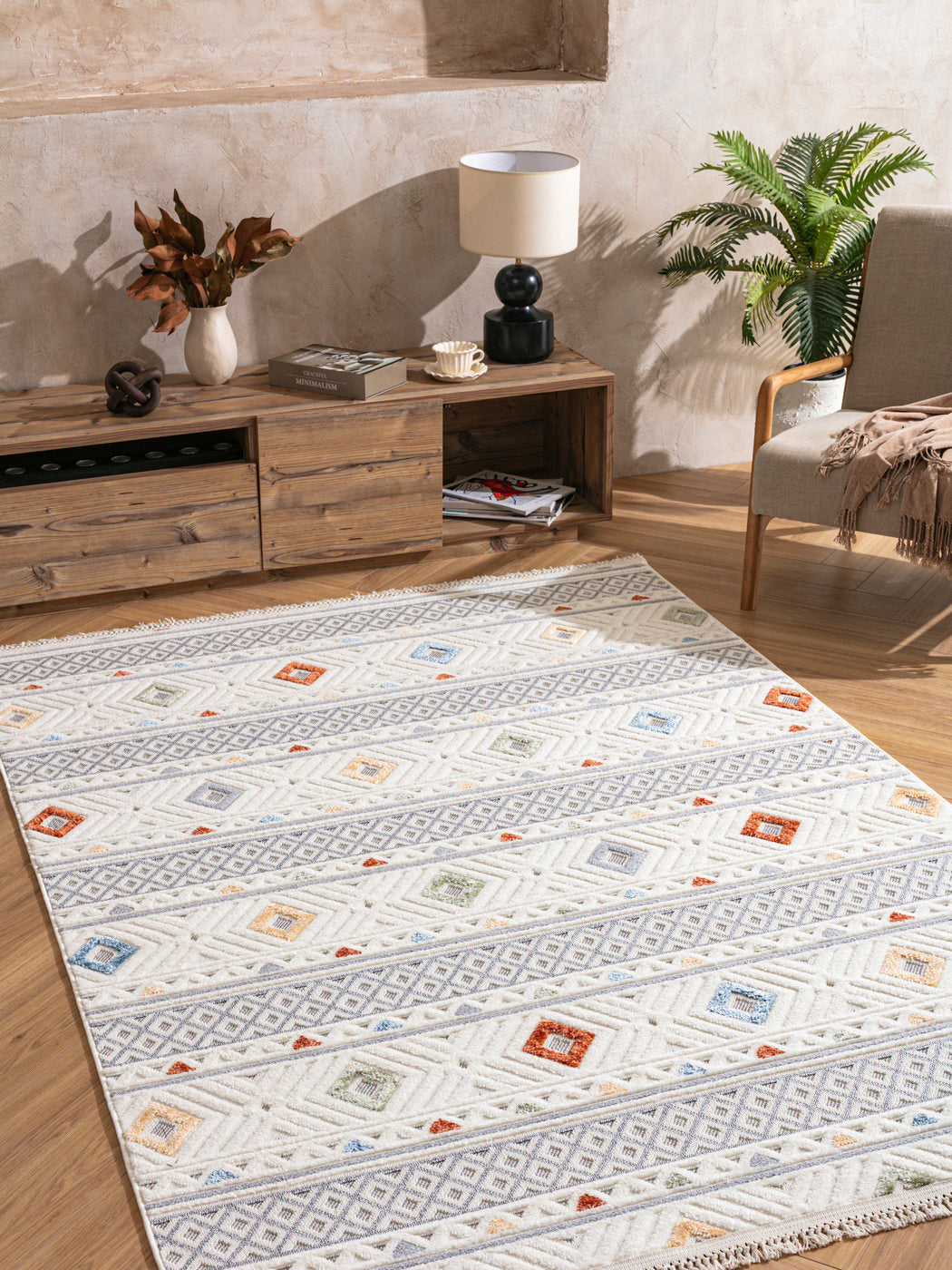 Mattan för tankarna till traditionell vävkonst, men med en nutida känsla – perfekt för barnrum, vardagsrum eller färgstarka hem.
