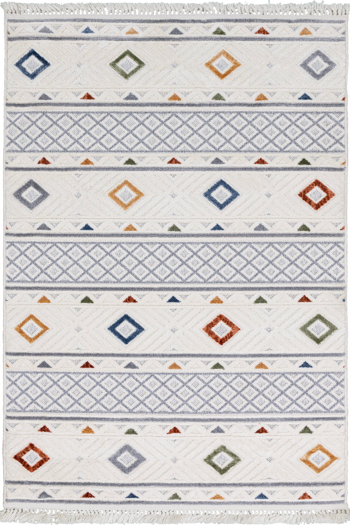 Madrid FärgMosaik är en livfull matta som kombinerar klassiska geometriska former med en modern färgpalett. Med sina symmetriska mönster i blått, grönt, rost, gult och grått mot en ljus bas, skapar den en varm och lekfull atmosfär i varje rum.