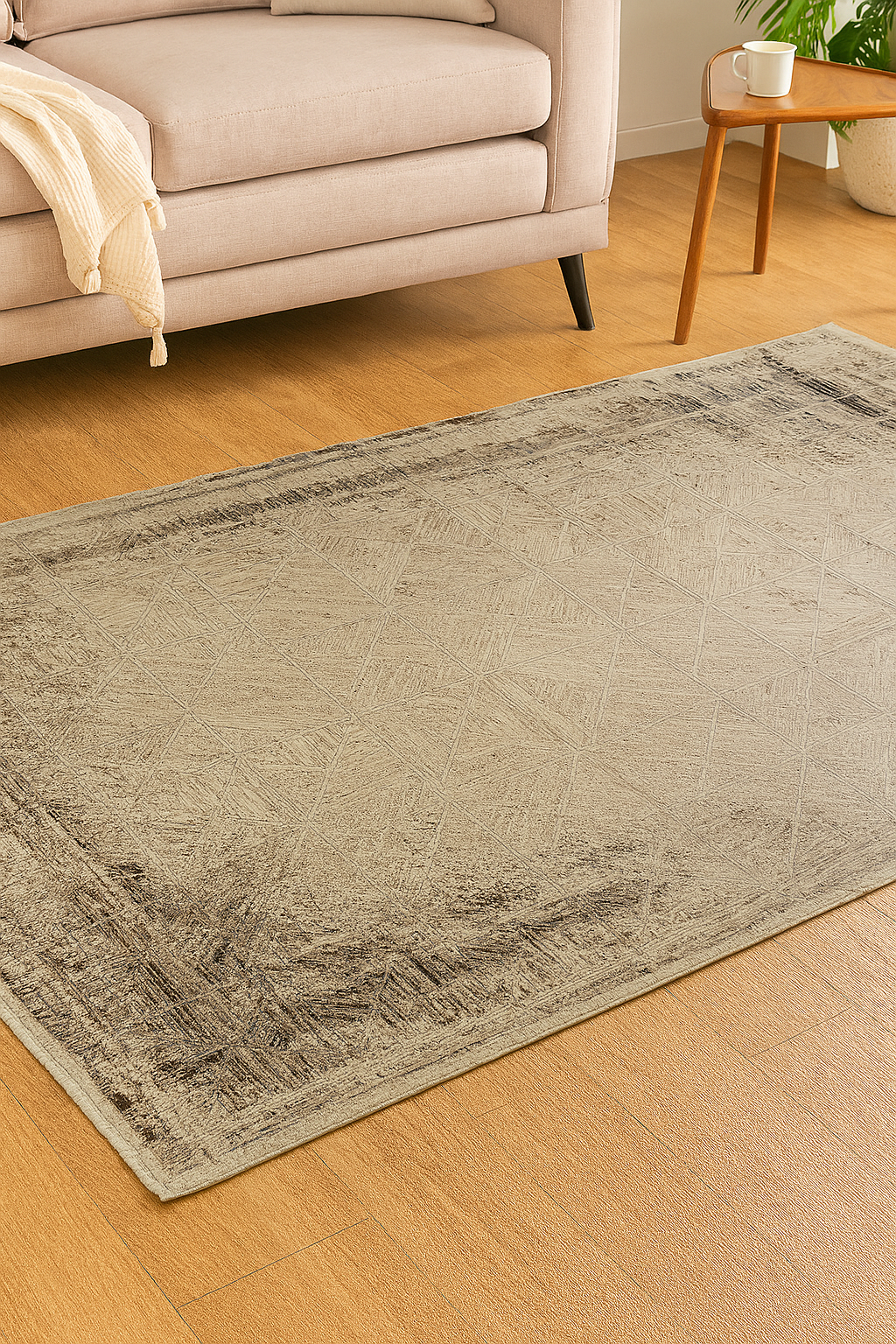 Mahlas Naturblock är en modern matta med ett distinkt geometriskt mönster som påminner om naturens råa stenformationer. De subtila tonerna i beige och grått skapar en balanserad yta med både djup och lugn, vilket gör mattan till ett sofistikerat val för samtida inredning.