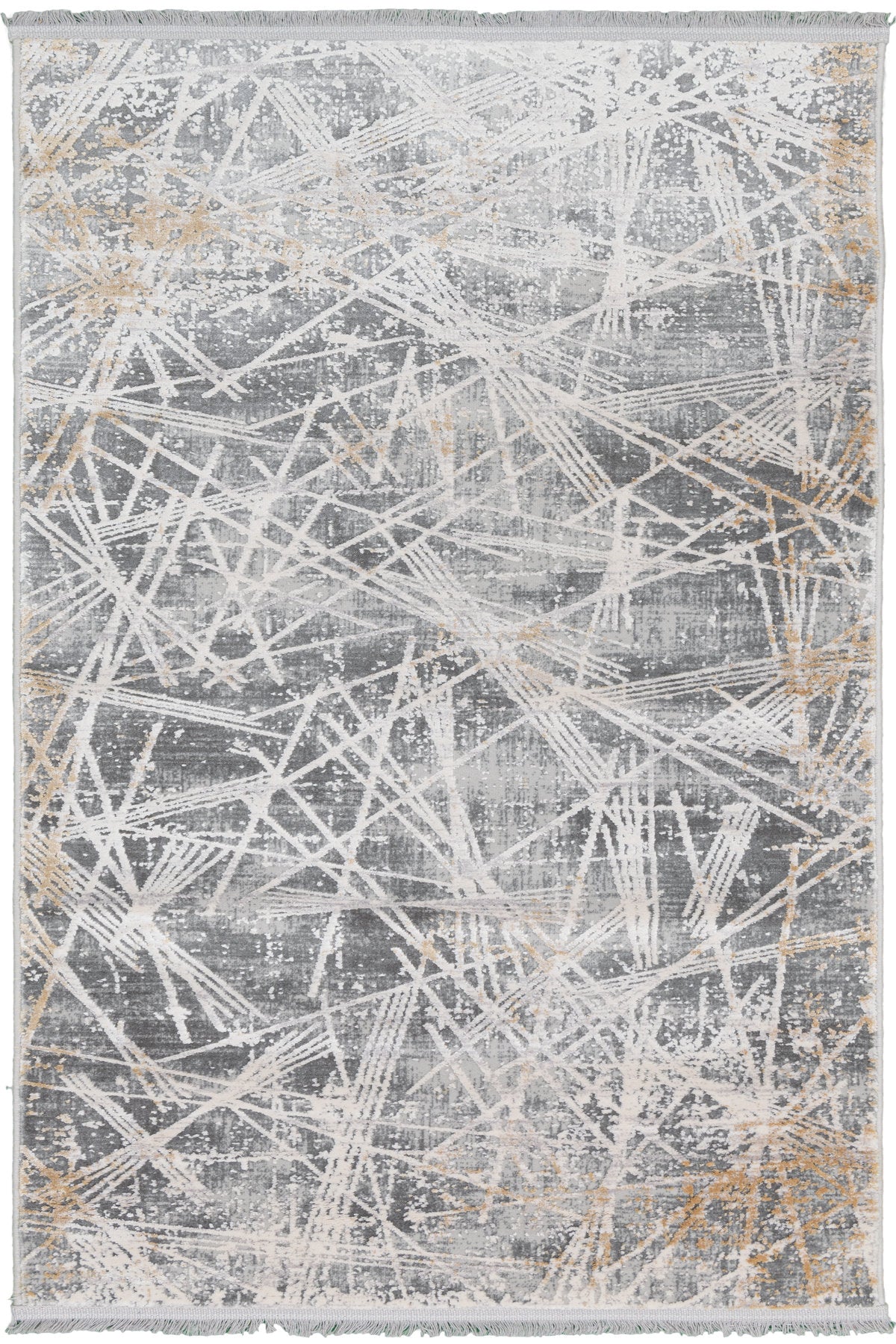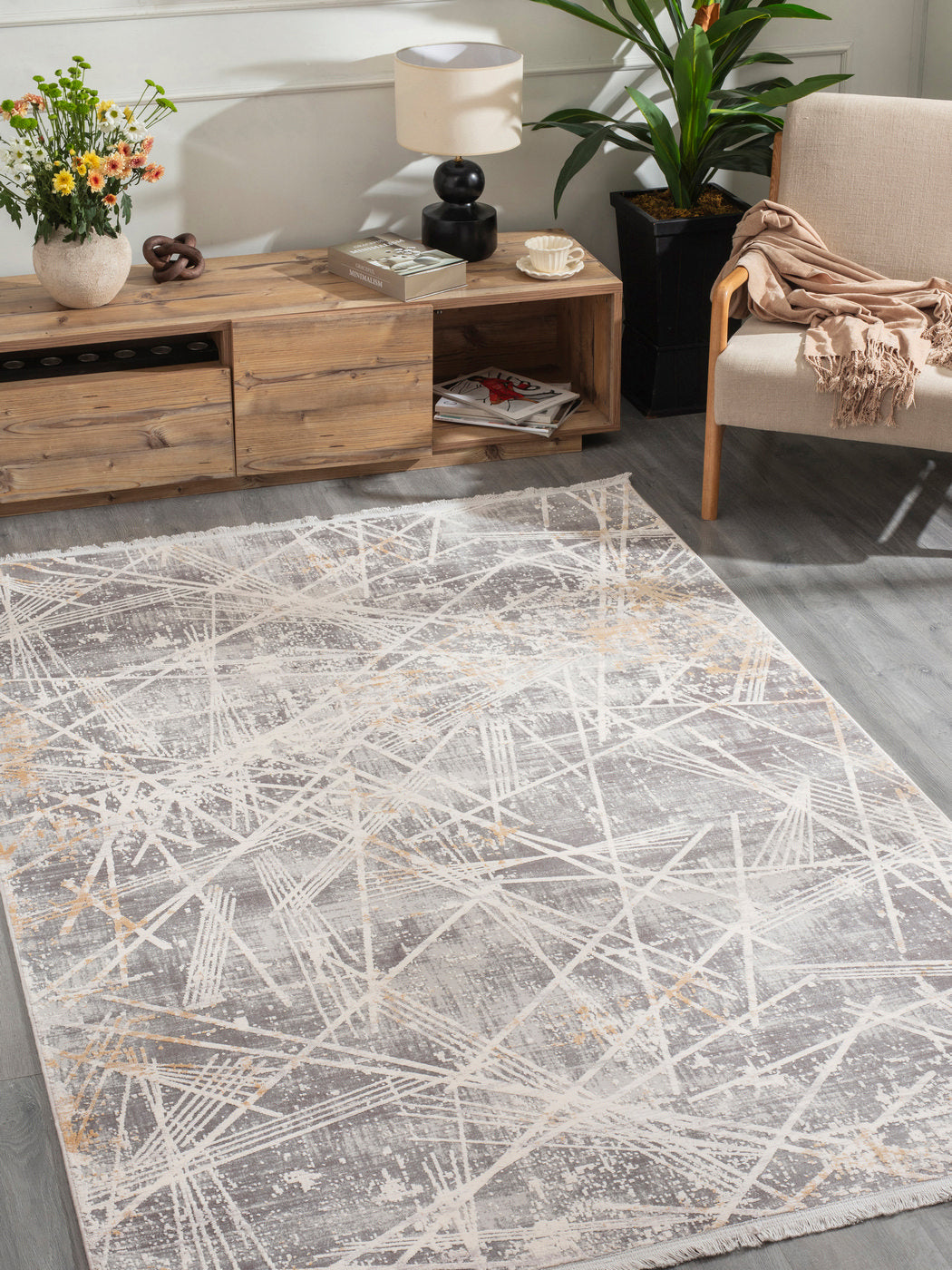 Marsilya SkifferGuld utmärker sig med ett kraftfullt uttryck där grafitgrå nyanser möter oregelbundna linjer i guld och benvitt. Den dynamiska ytan ger mattan ett konstnärligt djup och liv, samtidigt som färgkombinationen skapar en sofistikerad men jordnära känsla.