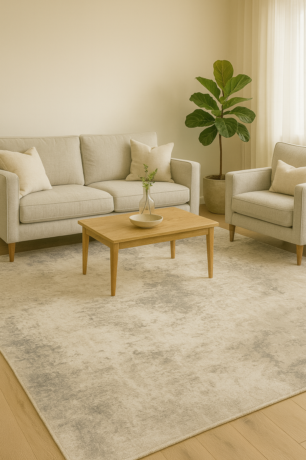 Moon Dust för tankarna till dimmiga landskap och naturlig stillhet. Med sitt abstrakta mönster i dämpade grå- och beige nyanser, skapar denna matta en harmonisk och lugnande atmosfär – idealisk för skandinaviska hem som värdesätter enkelhet och naturliga uttryck.