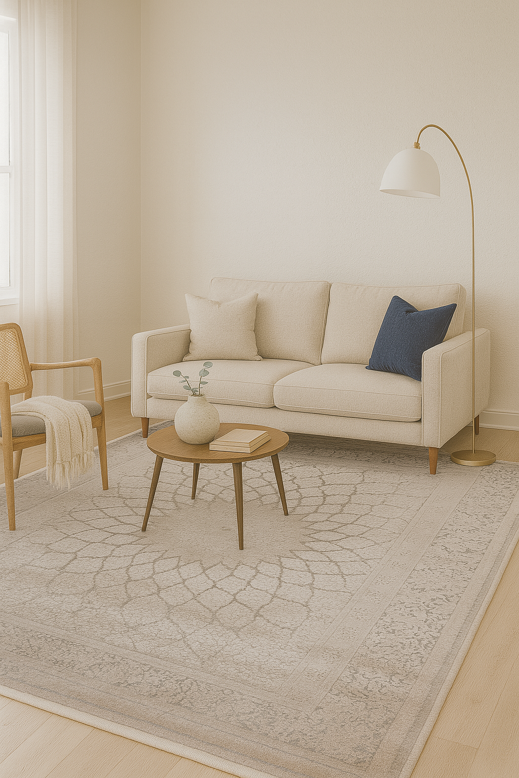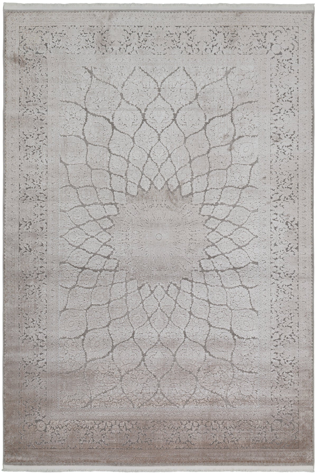 Nazenin LotusMönster imponerar med sin fängslande mittdesign som liknar ett blommande lotusmönster, där varje kronblad vecklas ut med geometrisk perfektion. Mattans sammansättning av silvergrå och varma taupefärger skapar ett lugnt och sofistikerat uttryck, perfekt för moderna hem med klassisk känsla.