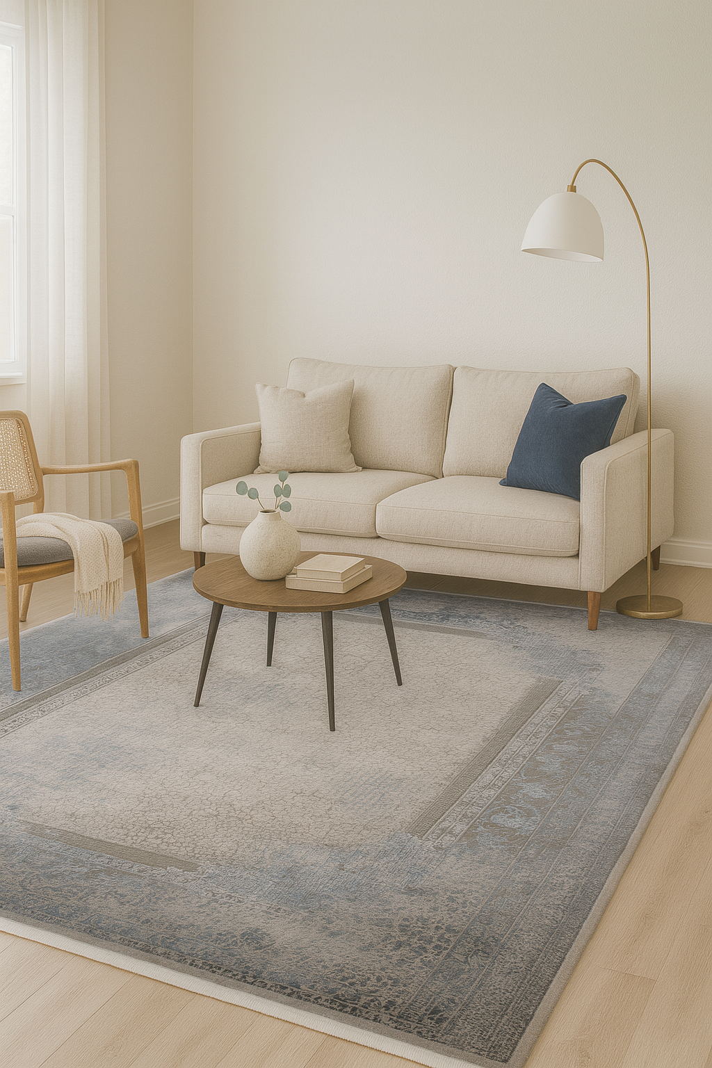 Den subtila balansen mellan mönstrad kant och lugn mitt gör mattan till ett perfekt val för dig som vill ha ett harmoniskt men uttrycksfullt golvinslag.