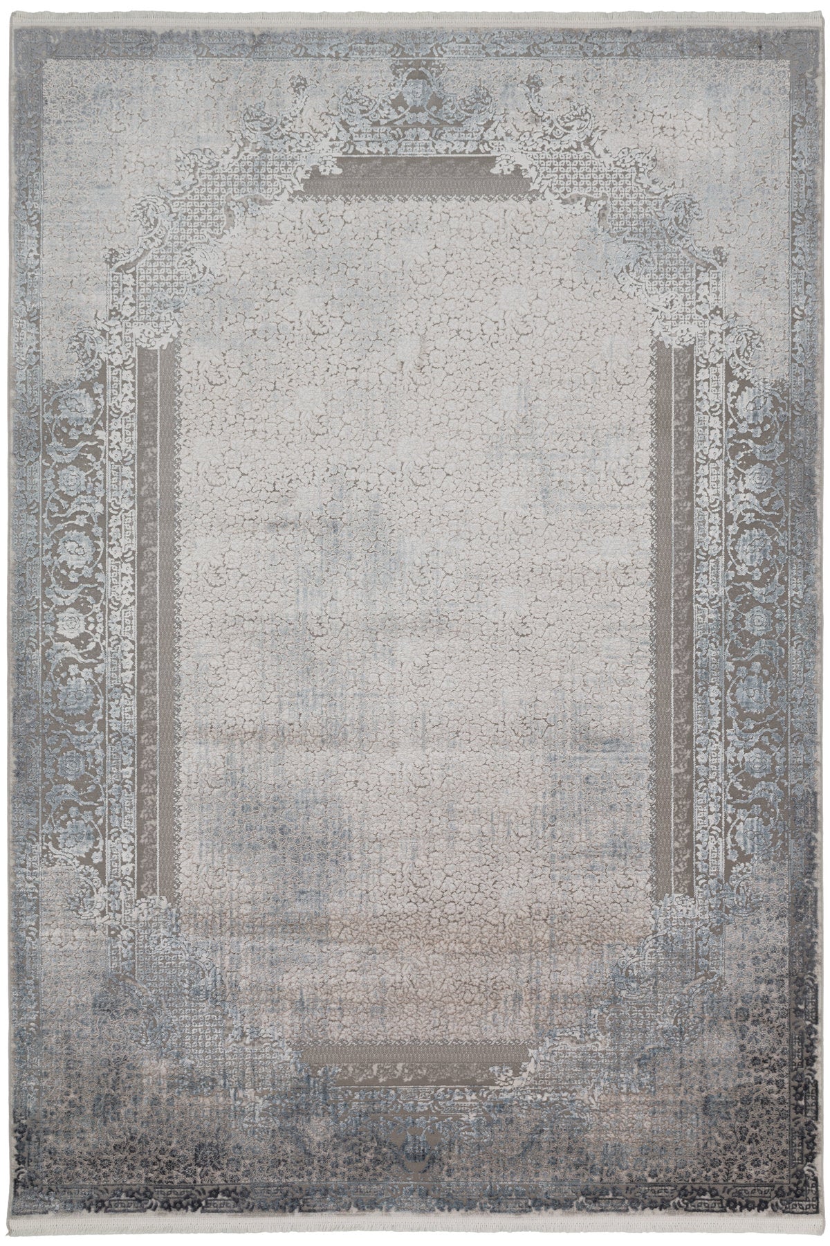 Nazenin Skymarmor kombinerar klassisk elegans med en modern känsla. Det sofistikerade hörnmönstret ramas in av en finstämd medaljongstruktur i marmorerade blågrå nyanser, vilket skapar en känsla av både lätthet och tyngd.