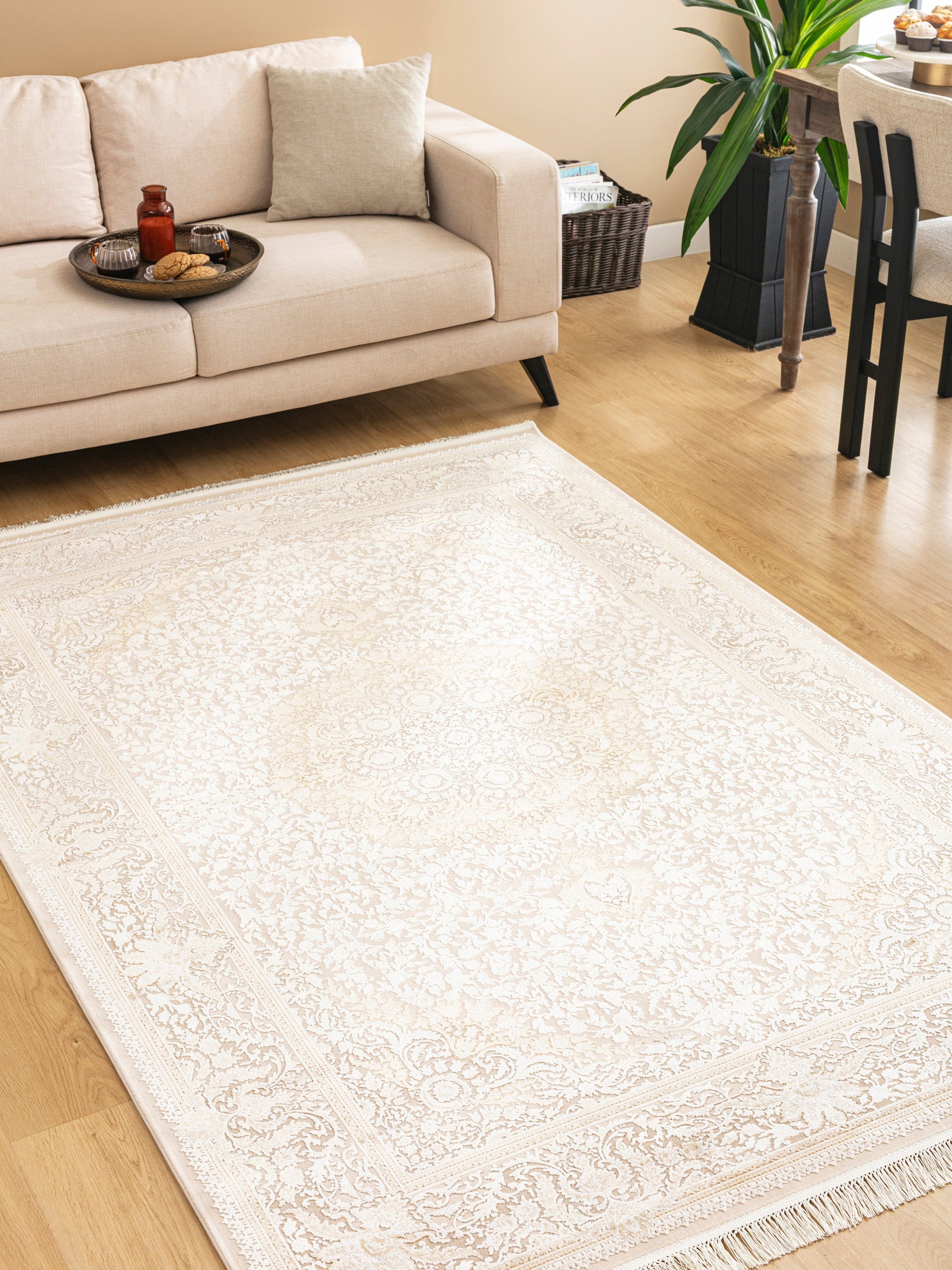 Nilüfer Elfenben är en elegant matta som utstrålar lugn och lyx genom sin klassiska medaljongdesign. Den krämvita botten kombineras med mjuka beige detaljer och fint definierade ornament, vilket skapar en sofistikerad helhet som aldrig går ur tiden.