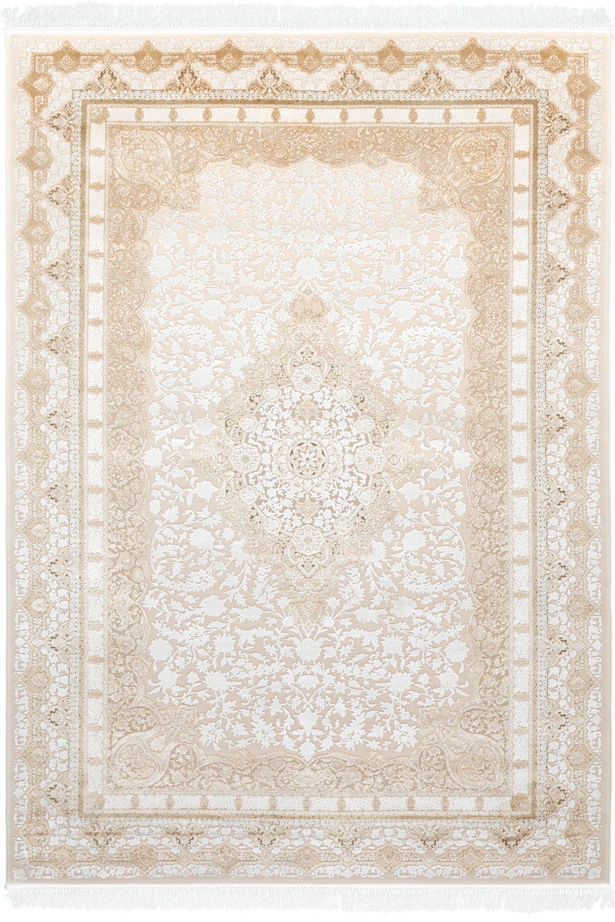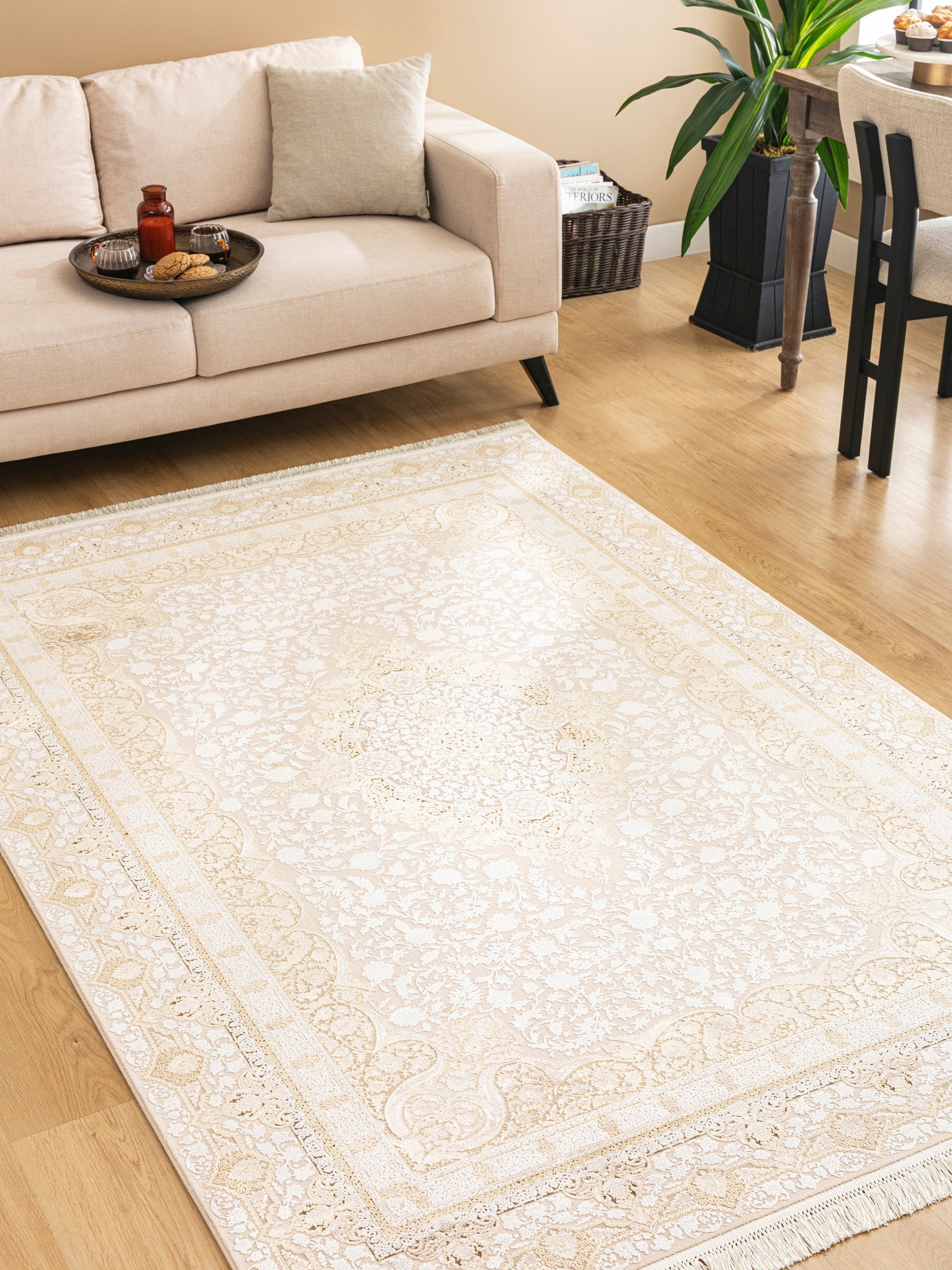 Nilüfer GuldRam är en klassisk matta med ett detaljerat medaljongmönster och rikt dekorerad ram i gyllene nyanser. Den varma elfenbensvita botten tillsammans med guldtonade ornament skapar ett intryck av kunglig elegans och orientalisk charm.