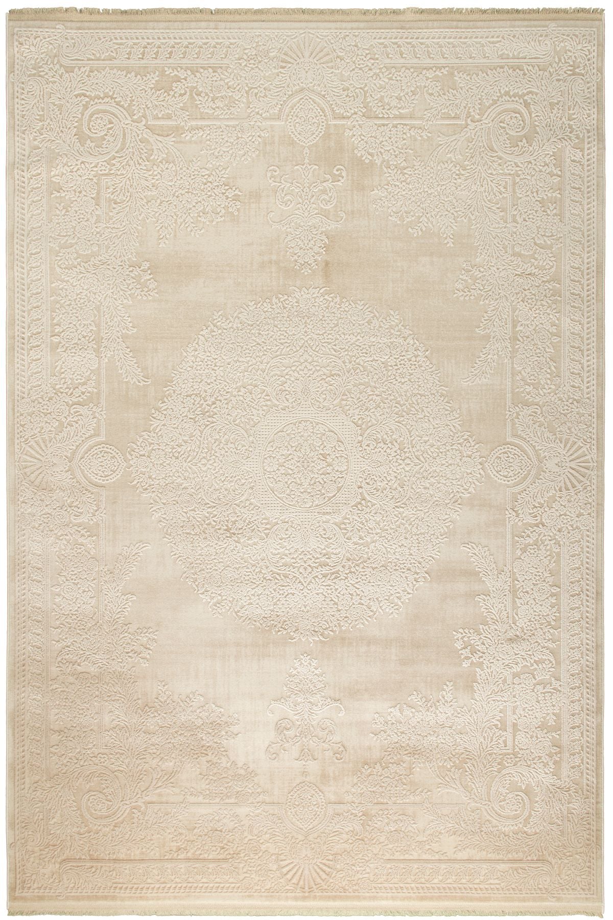 Den centrala medaljongen ramas in av intrikata botaniska motiv, vilket gör mattan till ett konstverk i sig – perfekt för att lyfta ett rum med lugn elegans.