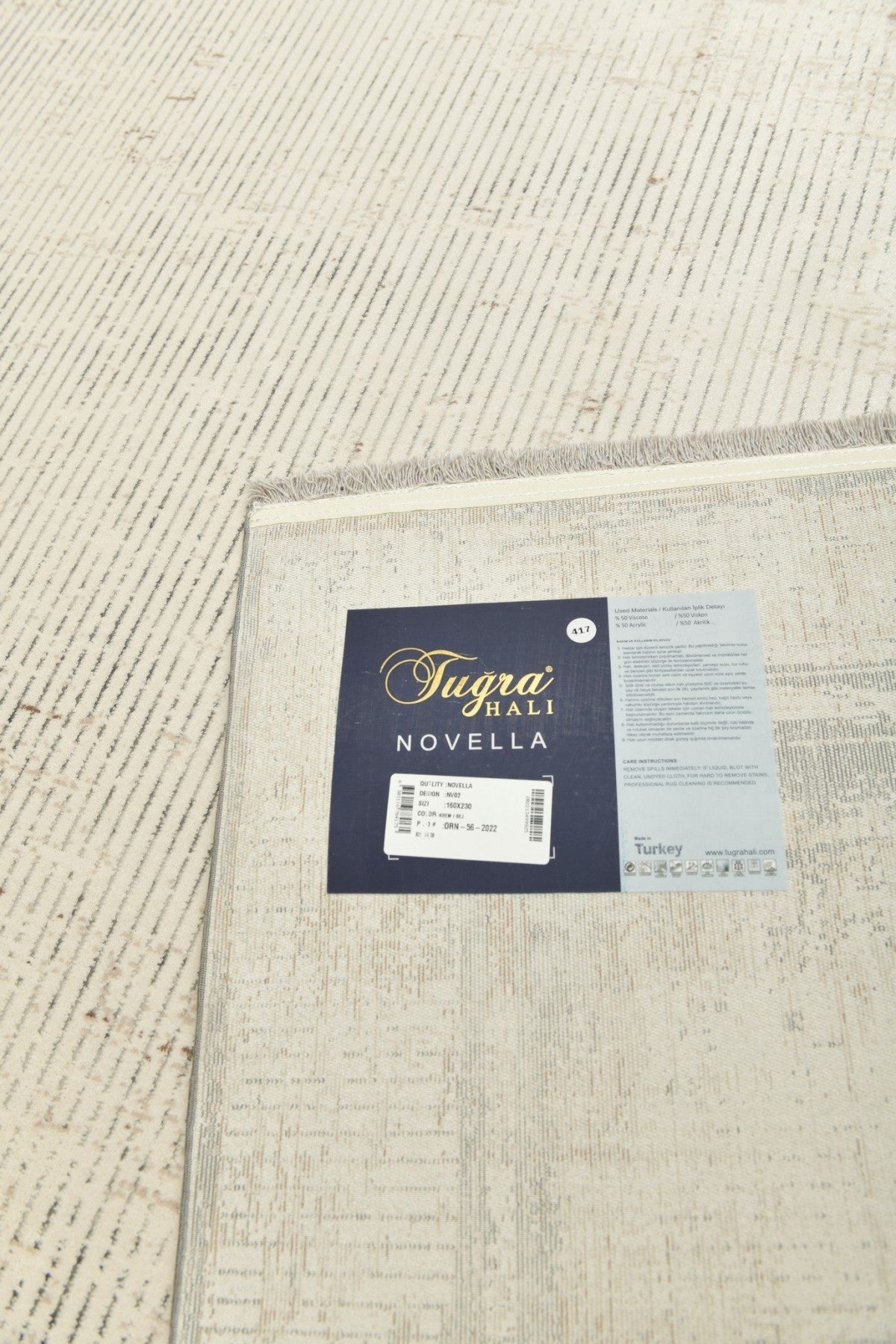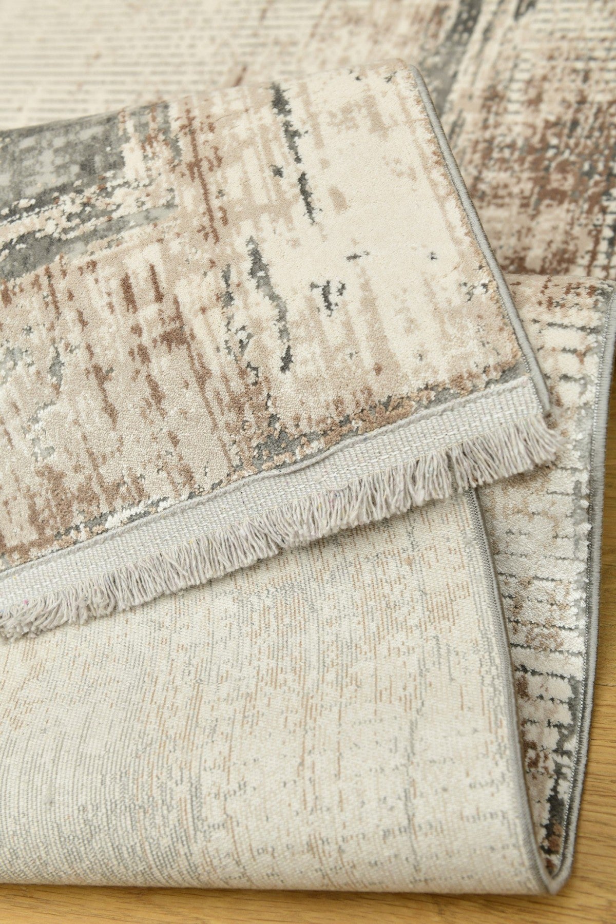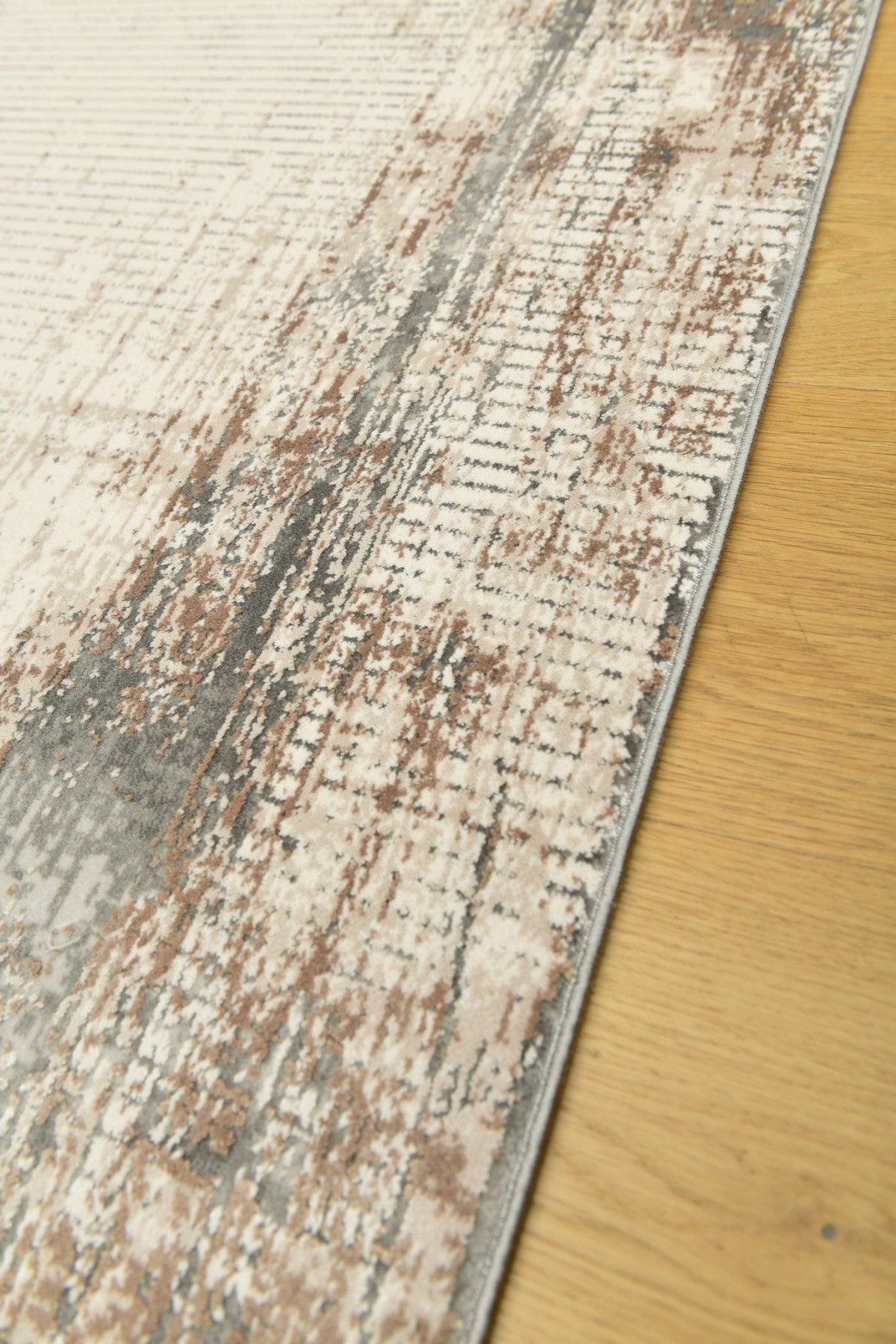 Novella Sanddimma är en modern matta med en återhållen men uttrycksfull design. Den ljusbeige ytan kombineras med dämpade nyanser av rost och dimgrått, vilket skapar en varm, naturlig känsla i rummet.