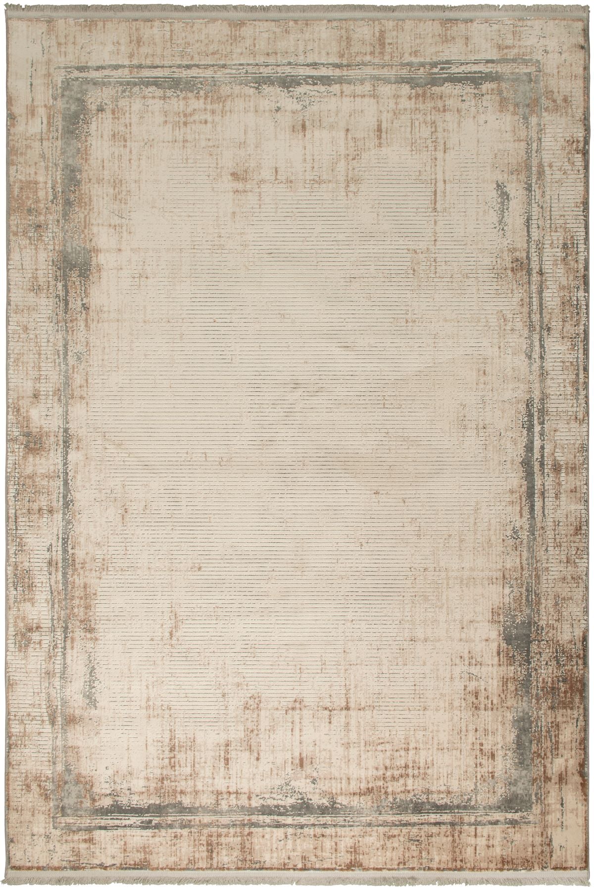 Den linjära strukturen i mitten kontrasteras av den svagt markerade ramen, vilket ger mattan ett mjukt djup utan att dominera inredningen.