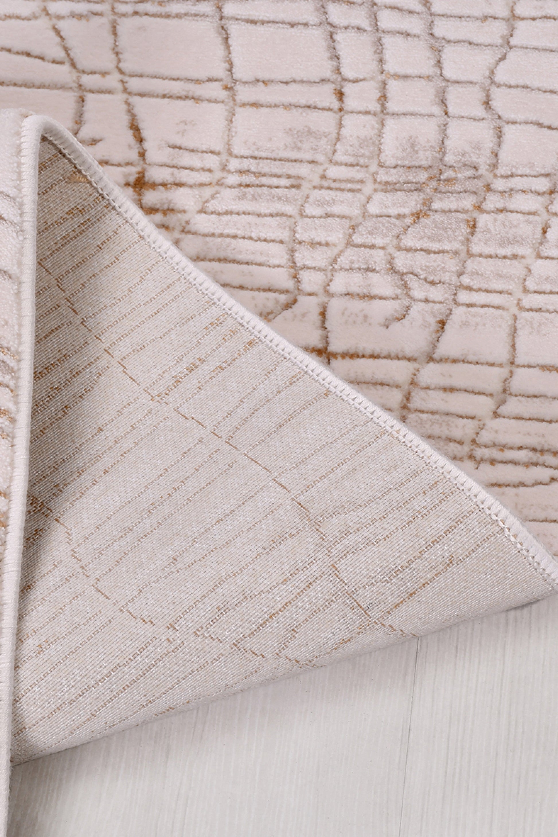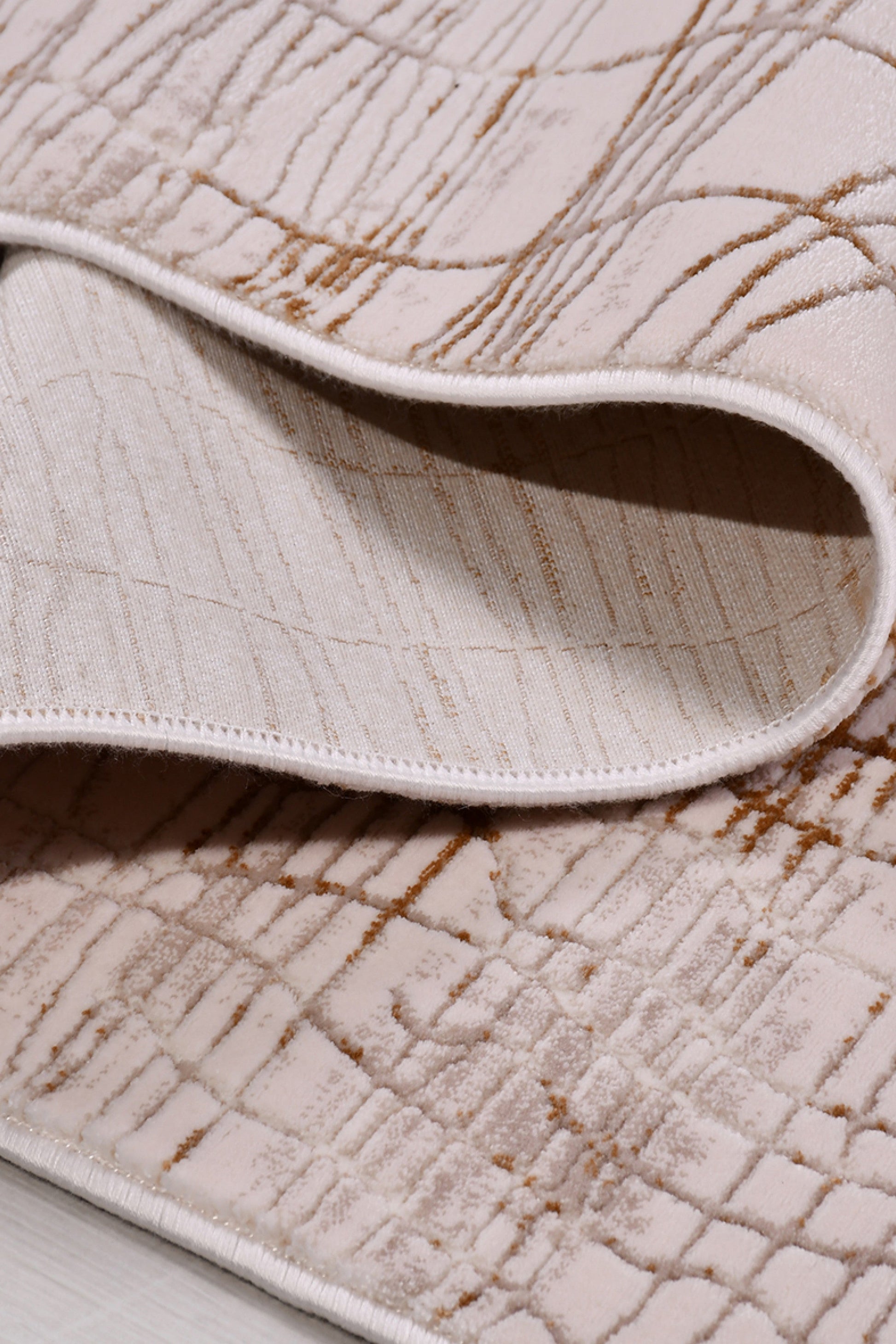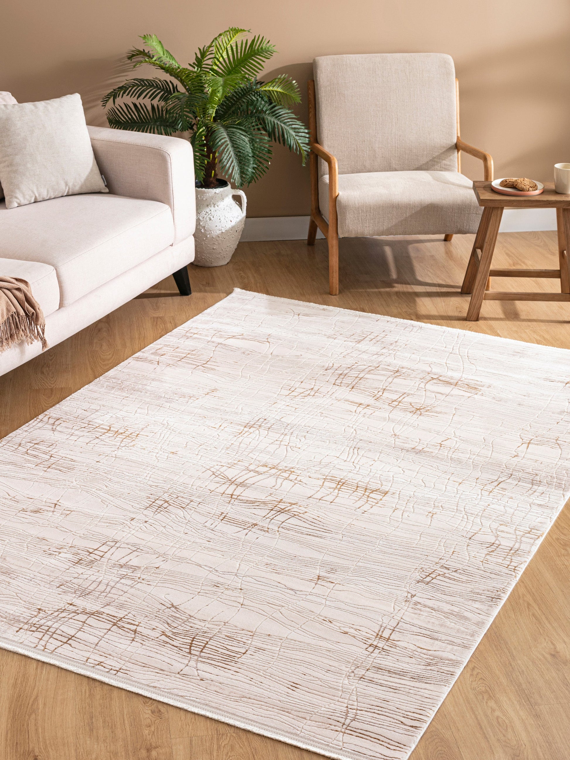 Ortaköy SandLinjär förmedlar ett organiskt uttryck genom sina böljande linjer som påminner om naturens mönster – likt sandens vindformade yta eller torkade jordskorpan. Den varma sandbeige färgtonen skapar en mjuk och jordnära känsla i rummet.