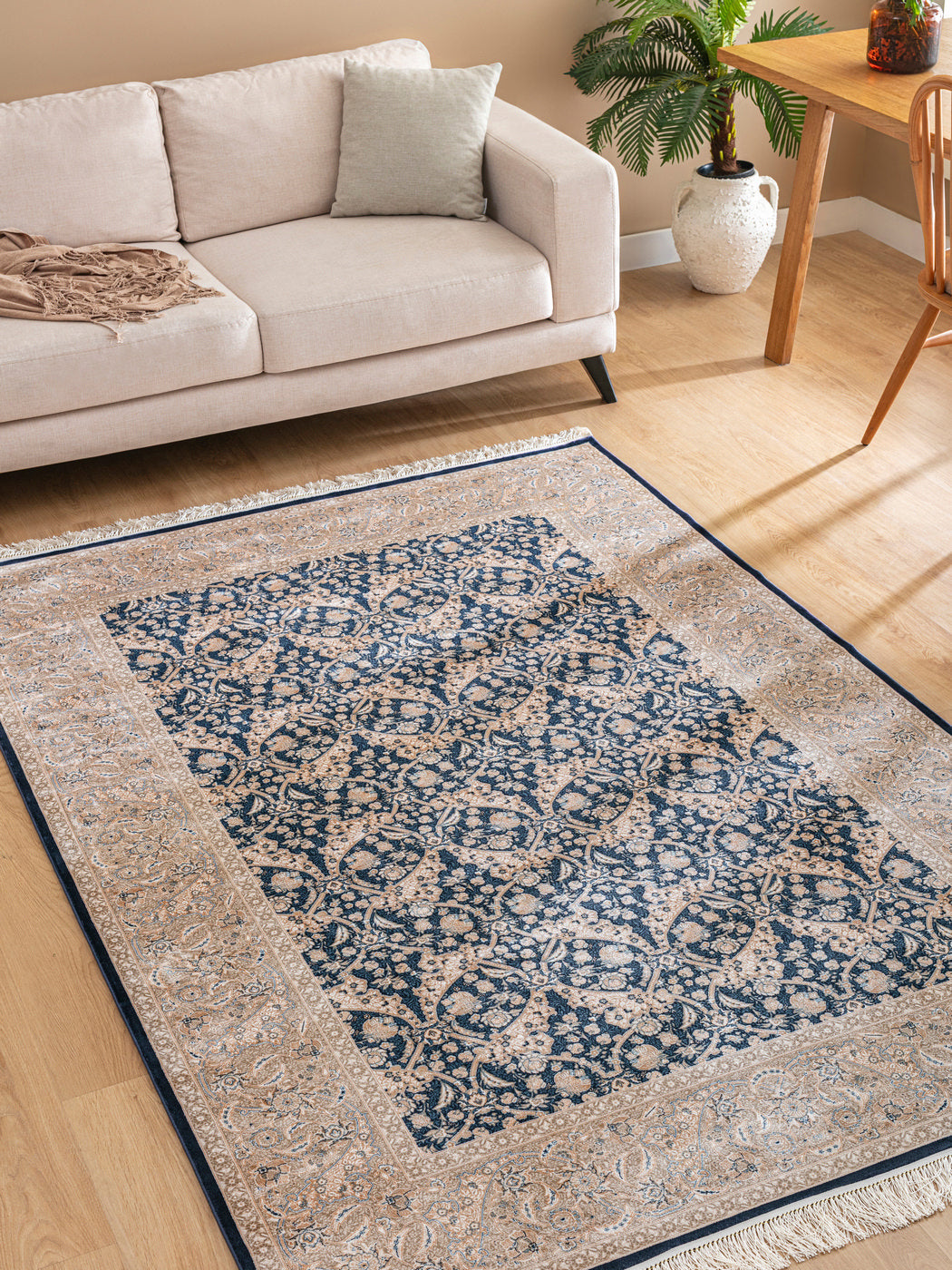Topkapı Floralis är en kunglig tolkning av naturens återfödelse. Med sina symmetriska blommor i nattblått och guldbeige skapar mattan en lugn men kraftfull närvaro – perfekt för hem som uppskattar klassisk skönhet med modern elegans.