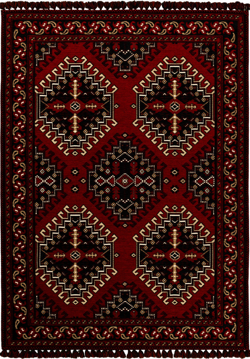 Türkmen Eldora är en imponerande matta med starka geometriska former och rika färgkontraster i vinrött, svart och guld. Mönstren bär på ett kulturarv från Centralasien och ger en majestätisk känsla till vilket rum som helst.
