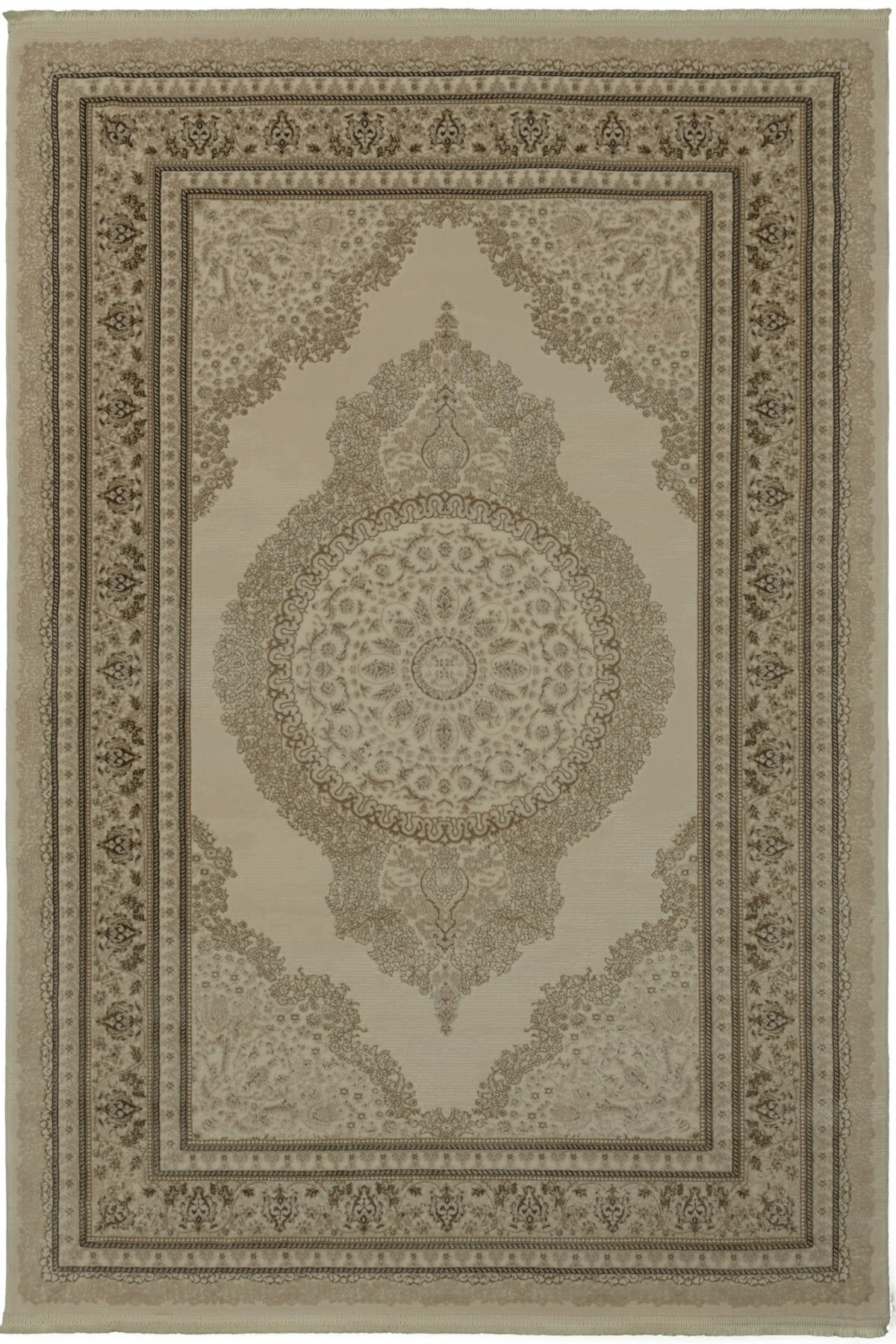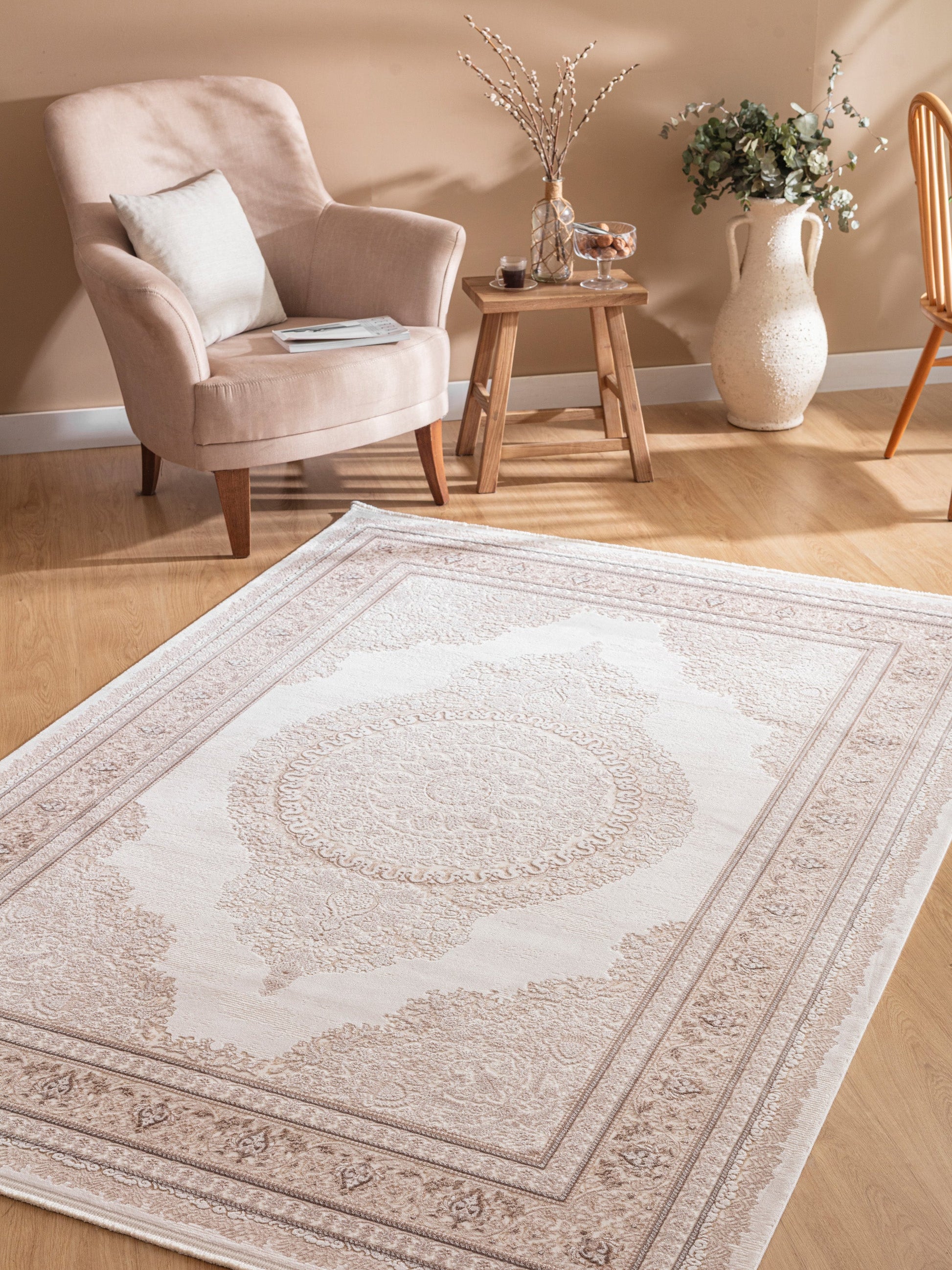 Selanik Natur – Handvävd Beige Matta med Klassisk Frans och Skandinavisk Look